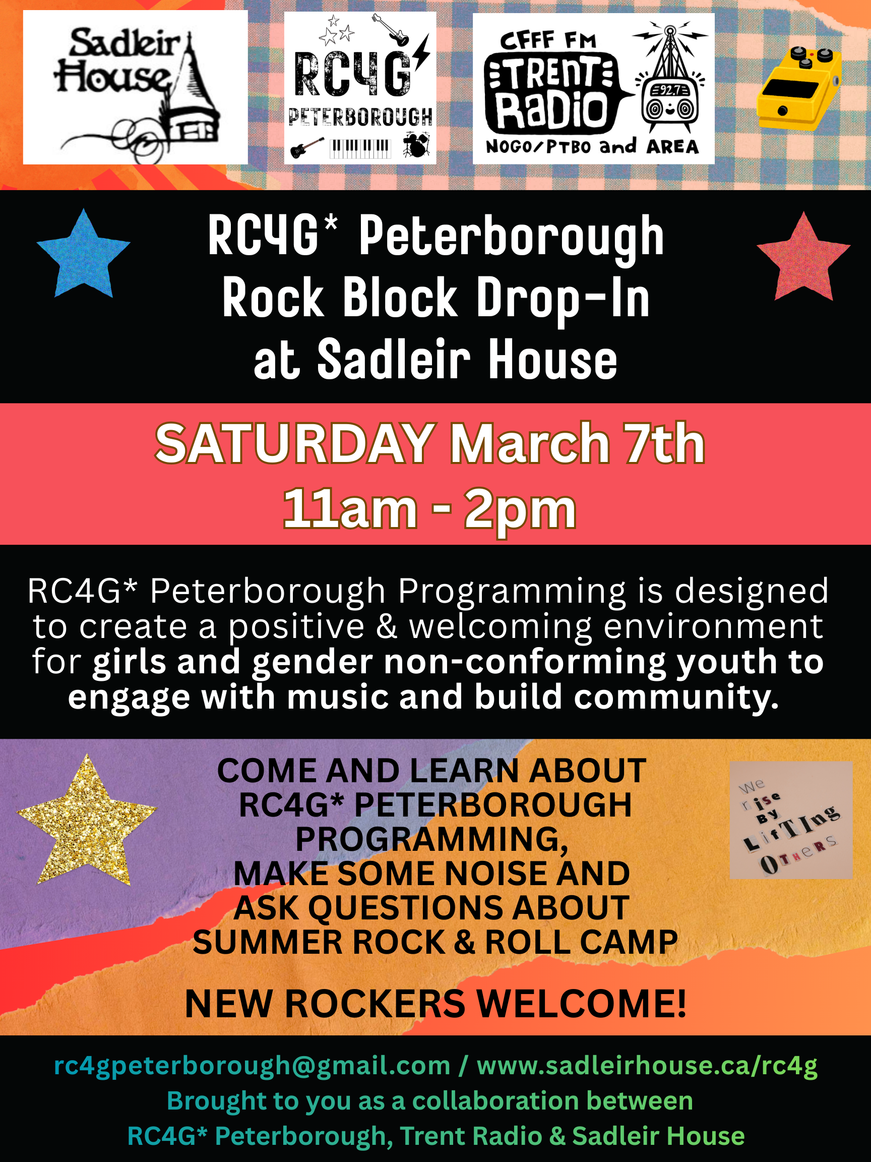 RC4G* Peterborough is a community group committed to creating inclusive spaces for girls & gender non-conforming youth to experience and explore rock music, gain confidence and build community. Since 2006 RC4G* Peterborough has been facilitating a range of community programming initiatives from summer camp to monthly jam sessions, community building events, skill building workshops and mentorship programs. After a brief hiatus from 2020 to 2024, RC4G* Peterborough, Sadleir House & Trent Radio joined forces to bring programming back to life with monthly Rock Block Sessions and Summer Rock & Roll Camp.