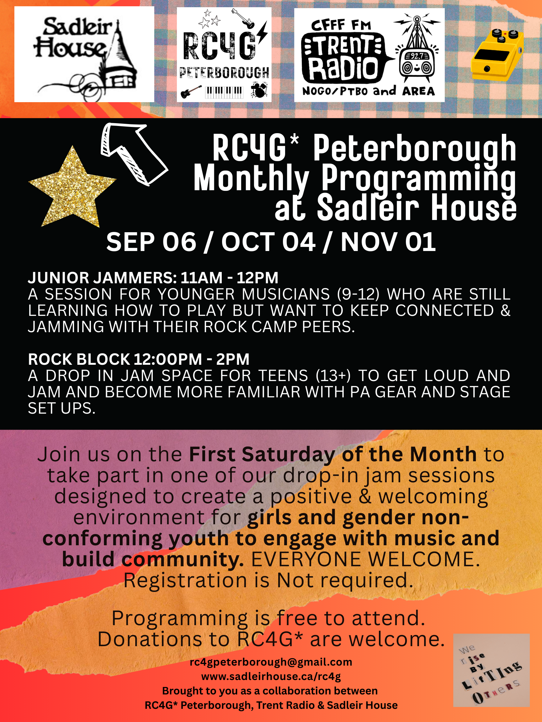 They'll be happening on the FIRST SATURDAY of the month (SEP 06/OCT 04/NOV 01) with an early session for JUNIOR JAMMERS, followed by our regular Rock Block for more experienced musicians. Programming takes place at Sadleir House in the Dining Hall.
